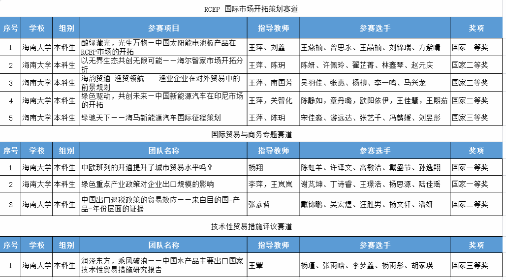 竞赛分为RCEP国际市场开拓策划赛道、国贸与商务专题及技术性贸易措施评议赛道3个赛道。在RCEP国际市场开拓策划赛道,国际商学院获国家级一等奖1项,国家级二等奖3项,国家级三等奖1项;在国贸与商务专题,国际商学院获国家级一等奖2项,国家级二等奖1项;在技术性贸易措施评议赛道,国际商学院获得国家级三等奖1项。