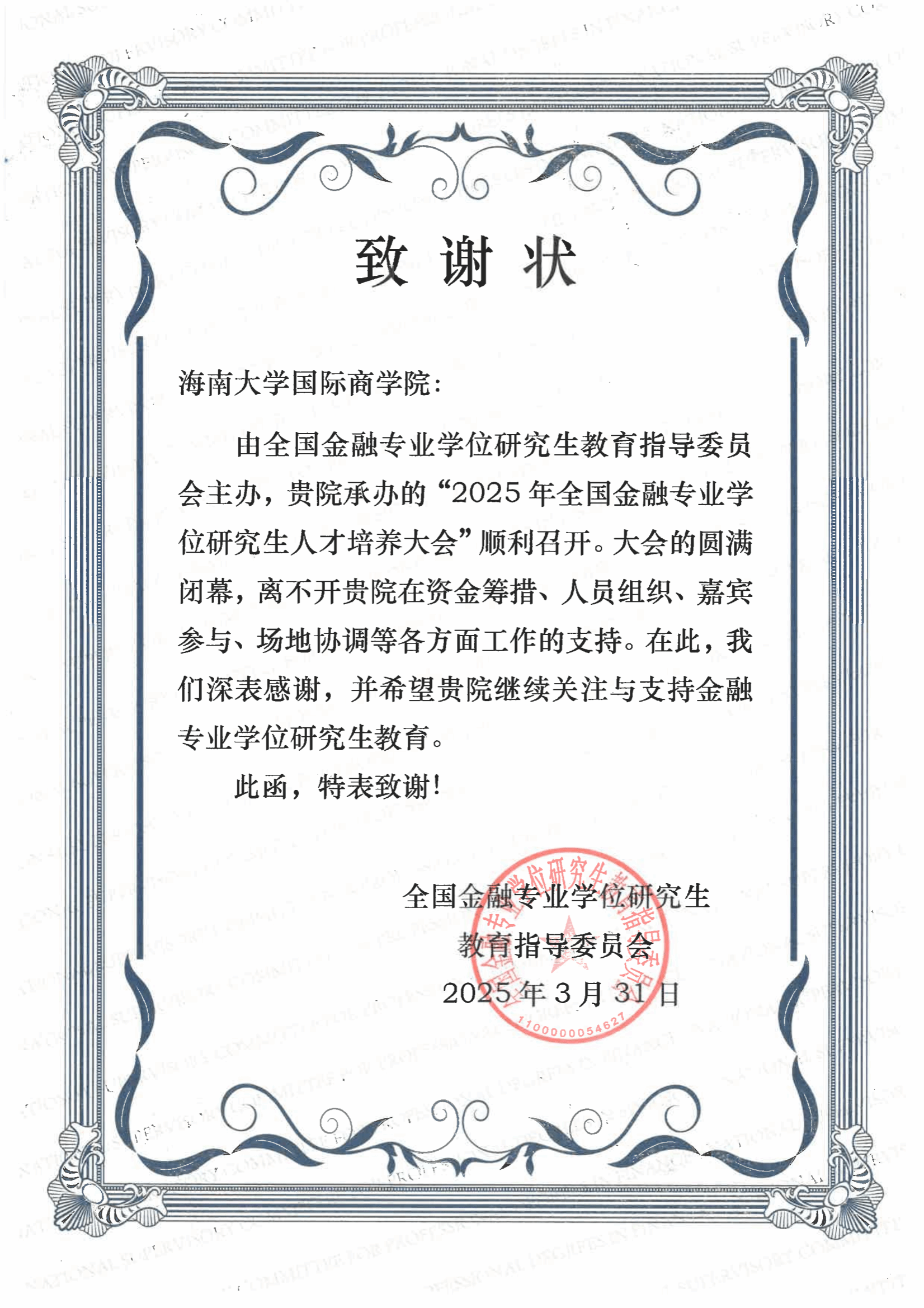 近日,PA视讯平台,PA视讯,PA视讯官网收到全国金融专业学位研究生教育指导委员会(简称全国金融专硕教指委)发来的致谢状,肯定学院对“2025年全国金融专业学位研究生人才培养大会”的出色承办。该会于2025年3月29日至30日在海南海口星海湾铂尔曼酒店召开。大会以“高水平金融开放与高质量金融人才培养”为主题,汇聚了来自全国百余所高校学科带头人、金融机构高管及行业专家等近300名代表参会,共商新时代金融教育改革与人才强国战略。