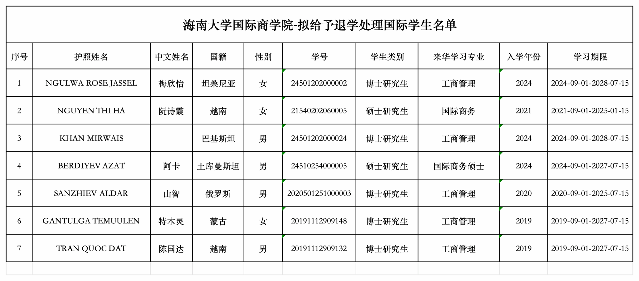 为进一步规范国际学生硕(博)研究生学籍管理工作,现按《PA视讯平台研究生学籍管理规定(修订)》(海大党政办〔2023〕56号)第三十二条关于研究生退学管理之规定,对拟清退国际学生进行公示,具体名单如下: