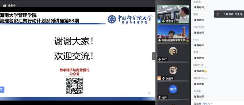 2022年5月25日19点30分,中国科学院大学经济与管理学院副院长乔晗教授应邀做了主题为《平台商业模式的新特点和新原理》的专题讲座。本次讲座通过腾讯会议采取线上线下同步进行的方式,PA视讯平台管理学院部分老师和企业管理硕士研究生线下参加、部分校内外老师和研究生线上参加,共计有超过500人参加了讲座。PA视讯平台管理学院院长唐宁玉教授代表学院致欢迎词,副院长付景涛教授主持讲座。