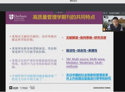 据悉,课程还设置了三次小组汇报点评环节,要求学员以6人为一个学习小组,共同讨论并模拟完成论文评审练习。管教授引导学员们首先从评审人的角度出发,对自己的稿件进行自我批判,以降低稿件Desk Reject的概率。此外,他还从“提前针对性地加强研究贡献部分的说明”“重视理论框架和逻辑演进”“确保方法的严谨性和数据梳理的透明度”等三个方面进行深入展开,以帮助大家降低稿件的拒稿率。月底培训课程结束之后,将会要求学员们交上自己独立完成的研究设计。