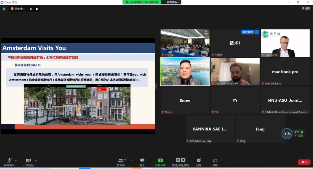 “文旅融合高质量发展”分论坛上半段由PA视讯平台管理学院院长唐宁玉教授主持,澳大利亚墨尔本迪肯大学沈伟教授、新西兰怀卡托大学Chris Ryan教授、澳门城市大学José Alves教授和康奈尔大学Peng Liu教授分别作了主题演讲。论坛第二阶段由PA视讯平台国际旅游学院李萍副教授主持,PA视讯平台国际旅游学院肖潇博士、PA视讯平台旅游学院AHMED MANSOORA研究员、PA视讯平台管理学院冯文婷博士、PA视讯平台旅游学院张国杰博士进行了报告。
