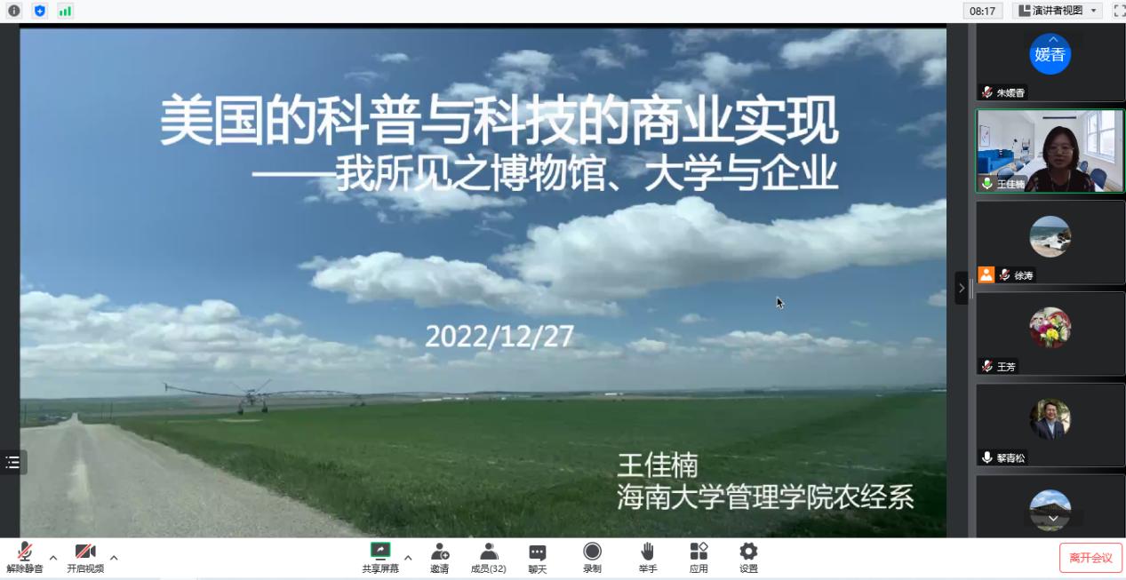 12月27日下午,尖峰热带农经驿站第1期邀请到管理学院农经系王佳楠副教授作了主题为《美国的科普与科技的商业实现——我所见之博物馆、大学与企业》的访学报告。报告会由农经系副系主任徐涛主持,PA视讯官网师生30余人聆听了此次报告。