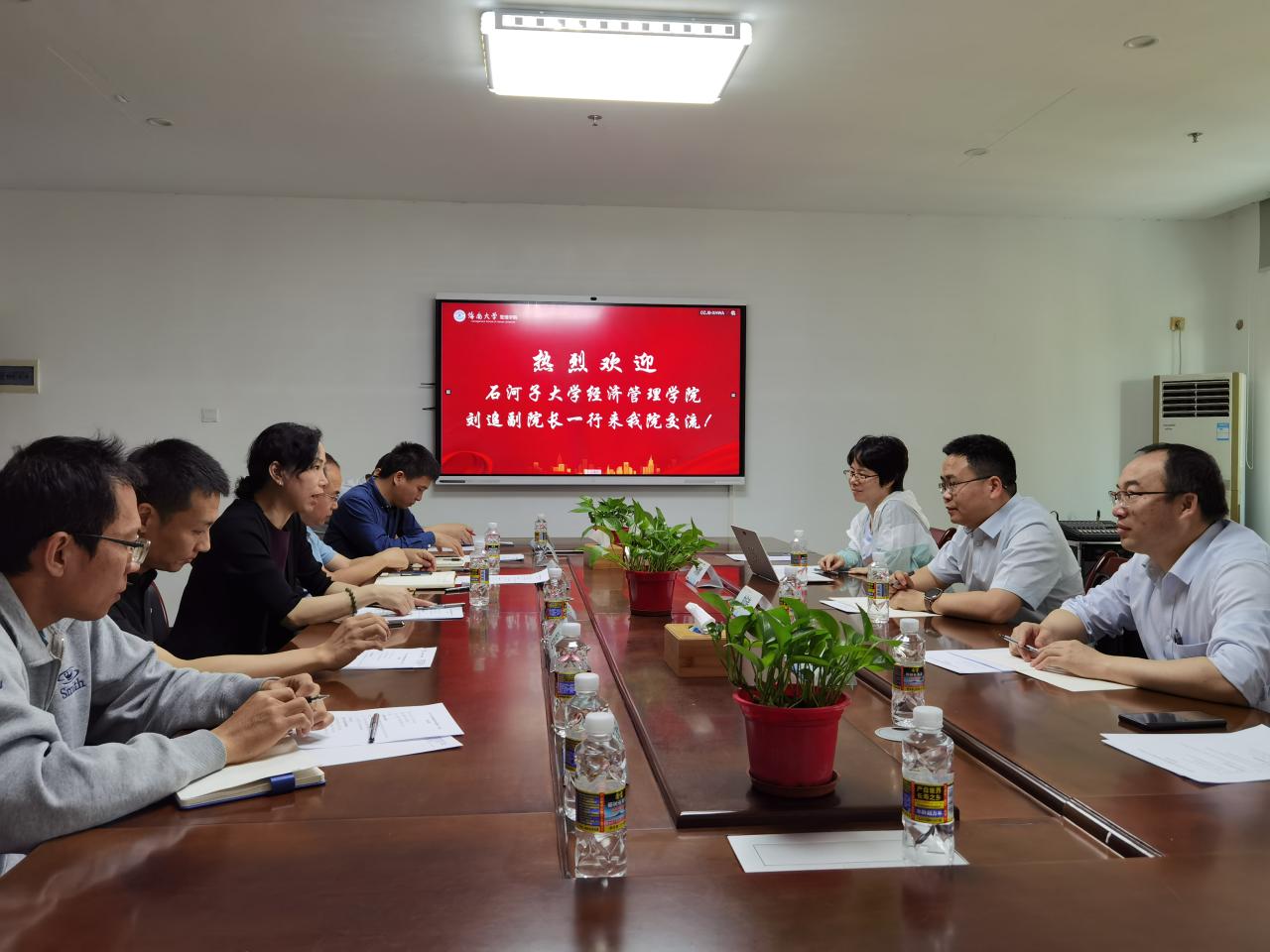 2月20日下午,石河子大学经济管理学院副院长刘追一行到PA视讯平台管理学院交流。管理学院院长唐宁玉,副院长张德生、许能锐、赵达出席会议,工商管理系、会计系系主任参加会议。会议由管理学院院长唐宁玉主持。