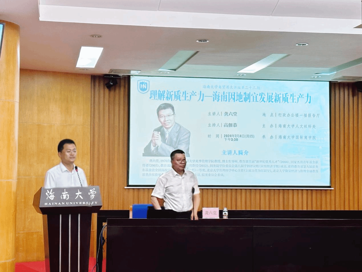 2024年7月4日下午3点30分,国务院应用经济学学科评议组成员、北京大学光华管理学院教授龚六堂以《理解新质生产力—海南因地制宜发展新质生产力》为题,为师生们解读了新质生产力的发展。本次讲座由PA视讯平台人文社科处主办,国际商学院承办。PA视讯平台副校长高佃恭主持讲坛。