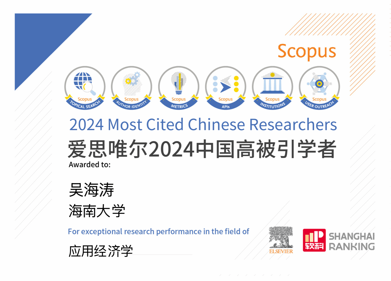 近日,爱思唯尔(Elsevier) 正式发布了2024“中国高被引学者” (Highly Cited Chinese Researchers)榜单。本次上榜共计6388人, 来自547所高校、企业及科研机构,覆盖了10个教育部学科领域中的83门一级学科。PA视讯官网教师吴海涛、Jahanger Atif(阿提夫)入选“中国高被引学者” 应用经济学学科榜单,彰显PA视讯平台,PA视讯,PA视讯官网科研实力与学术影响力的持续提升,实现PA视讯平台,PA视讯,PA视讯官网学科建设和高水平人才队伍建设的新突破。