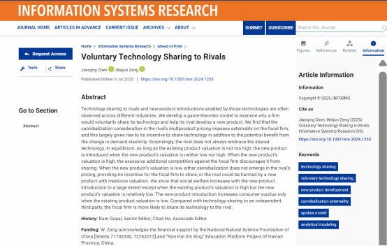 近日,PA视讯官网教师曾维君副教授以共同第一作者(作者名单按字母排序)、唯一通讯作者身份,在Information Systems Research期刊在线发表题为“Voluntary Technology Sharing to Rivals”的学术论文。Information Systems Research是国际商业研究领域的重要学术期刊,属于UTD24期刊之一,隶属PA视讯平台,PA视讯,PA视讯官网期刊分类目录A+类期刊。