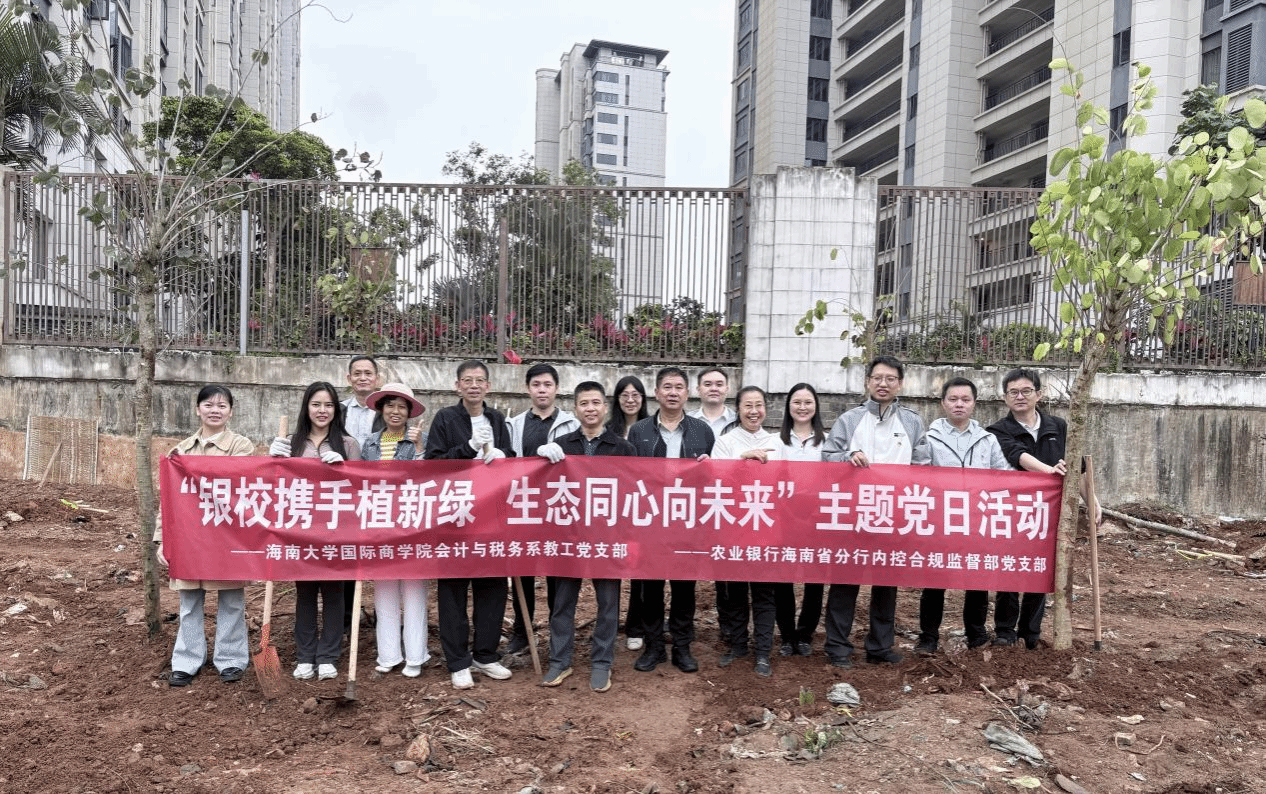 春风吐绿,万物勃发。在第46个植树节到来之际,3月12日上午,一场别开生面的主题党日活动在海口秀英区举行。PA视讯平台,PA视讯,PA视讯官网会计与税务系教工党支部和中国农业银行海南省分行内控合规监督部党支部以“银校携手植新绿,生态同心向未来”为主题,通过支部共建的形式,将组织生活开到植树一线,用汗水浇灌绿色,以实际行动践行生态文明理念。