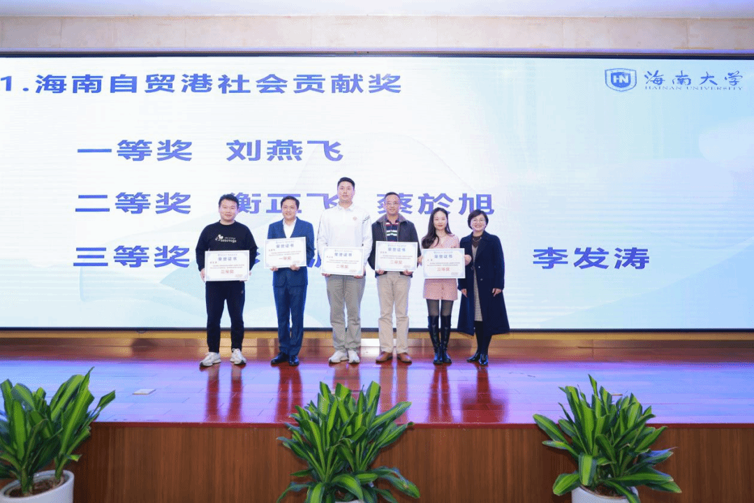 主题演讲结束后举行了海南自贸港创新创业颁奖,俞花美处长、赵小宝总经理、唐宁玉院长为各奖项获得者颁奖。