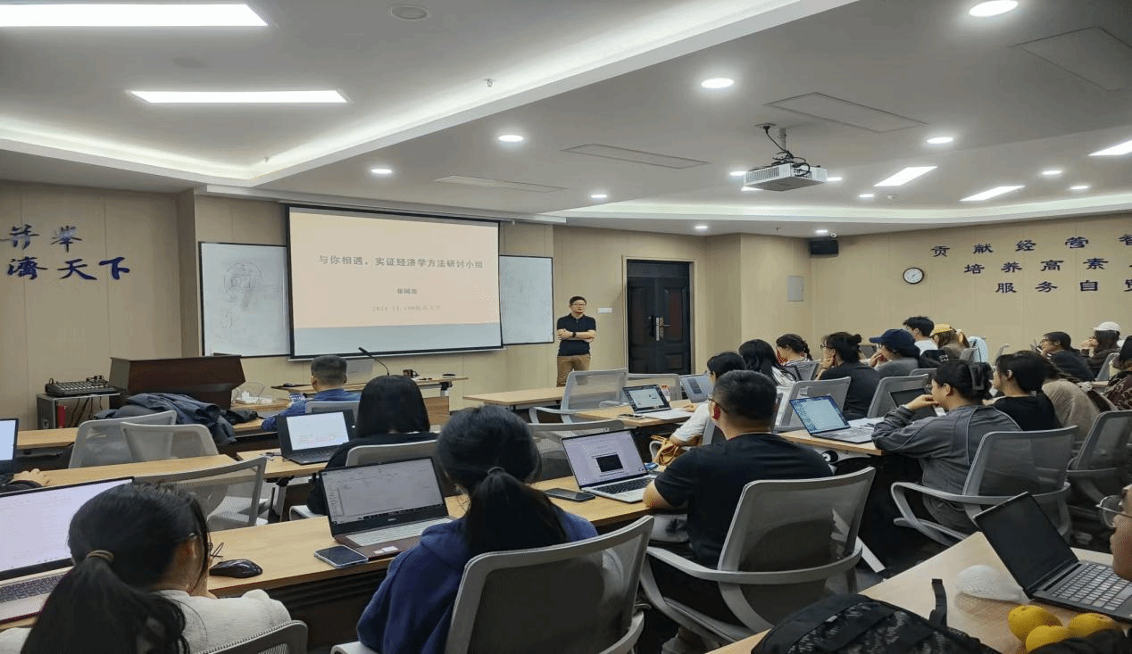 在介绍完前沿方法后,张同龙教授进一步讲述了组建实证经济学方法研讨小组的缘起、定位和预期目标,并提出了对小组成员的要求。着重强调,希望大家在学习的过程中,不仅要熟练掌握计量经济学课堂上的理论知识,更要让真实的数据“弄脏”自己的手。通过实践操作,将具体方法运用在自己的实证研究设计当中,将自身原有抽象理论的思辨向着基于实证证据的甄别与验证靠近,逐步成为一名手握识别因果关系“利剑”,且“能打”的实战新锐学者。
