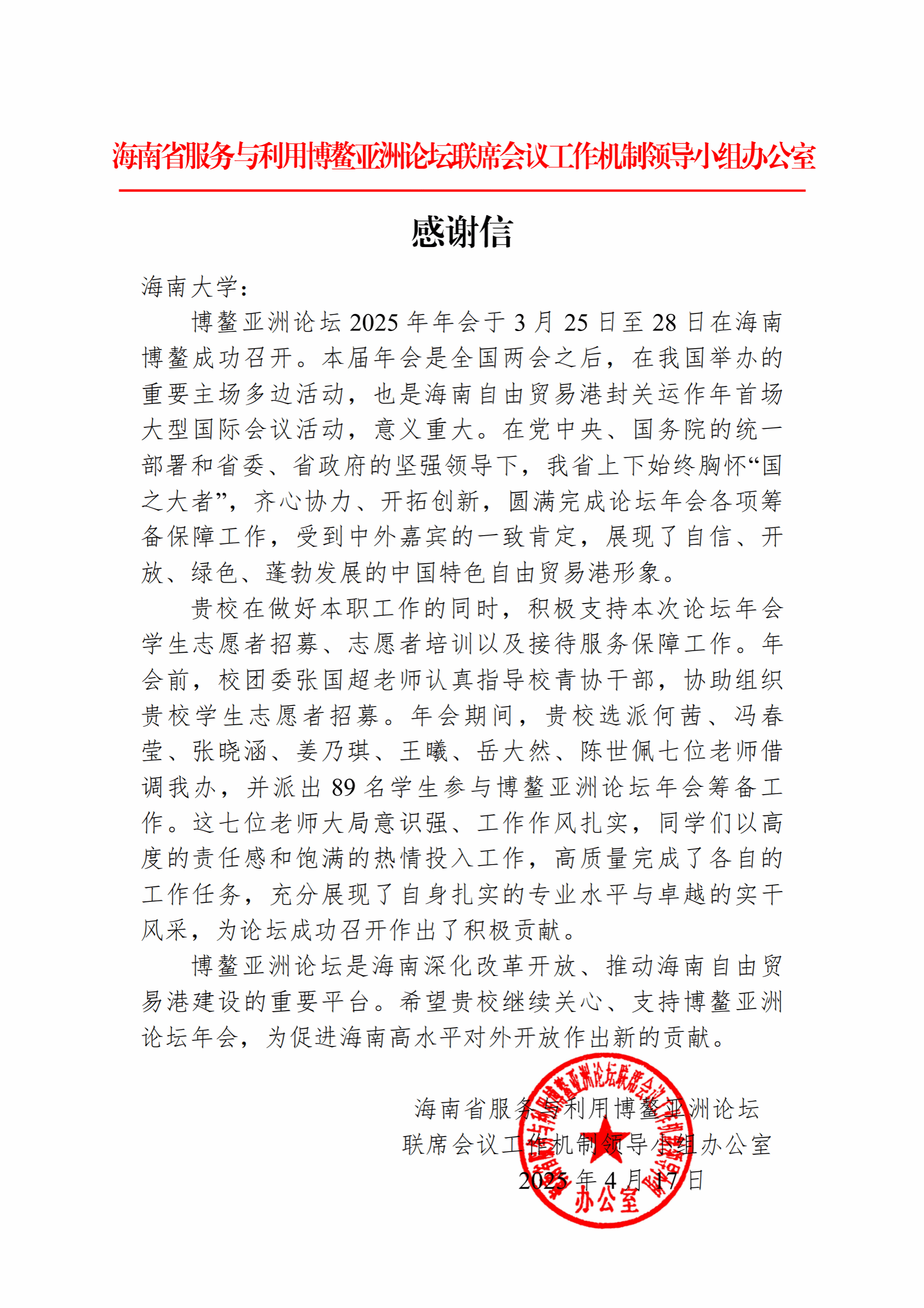2025年3月25日至28日,博鳌亚洲论坛年会在博鳌举办。PA视讯平台,PA视讯,PA视讯官网国际合作交流中心副主任陈世佩老师借调至论坛年会政要组,作为教职工志愿者积极投身志愿服务工作,为论坛年会贡献一份力量。