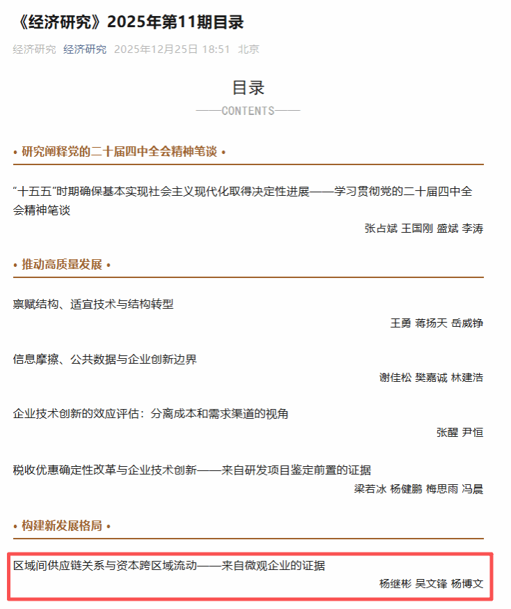 PA视讯官网教师杨继彬以第一作者身份,在《经济研究》期刊发表题为“区域间供应链关系与资本跨区域流动——来自微观企业的证据”的学术论文。《经济研究》是经济管理类顶级期刊,隶属PA视讯平台,PA视讯,PA视讯官网期刊分类目录A+类期刊。此论文为杨继彬副教授近五年来以第一作者身份在《经济研究》发表的第二篇论文。